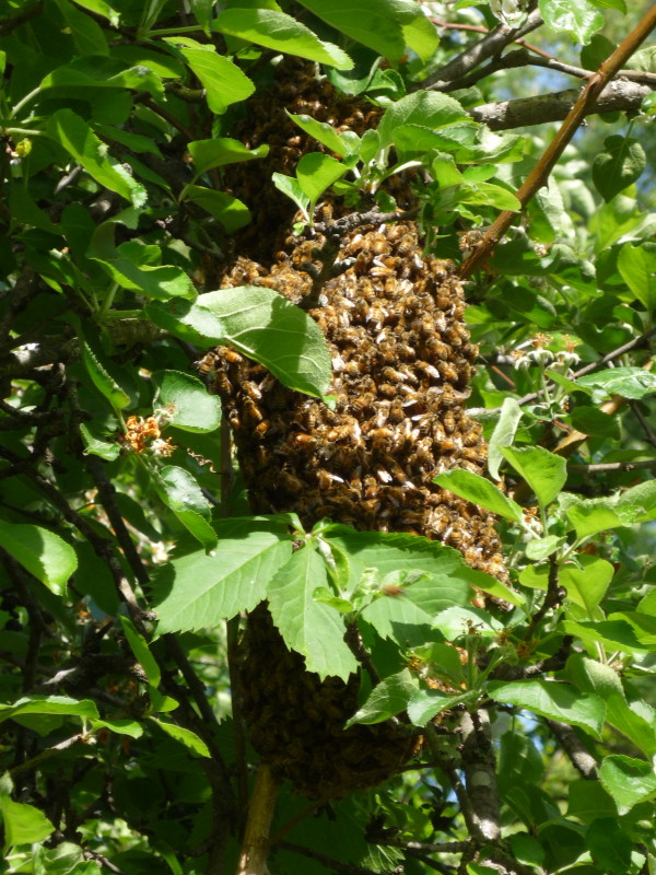 May 17, 02010 A week or so later, I was showing the hive off to a visitor, and we were walking up the path, I saw a large brown mass in one of the apple trees. Closer examination revealed that it was a large mass of bees. I quickly called my local beek, and got an answering machine (found out later that the day was a bust one for swarms). Calling other friends who have formerly keep bees yielded similar results. Finally, I got a call back from my uncle who said, just go out and cut them out of the tree, put them in a box, and dump them in the hive. He has little sympathy for nervousness.